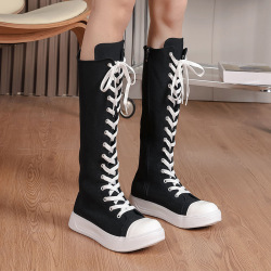 クロスボーダー 2025 春の新作大きいサイズの婦人靴ハイチューブストラップサイドジッパーキャンバスシューズシンプルなロングチューブニーハイブーツ