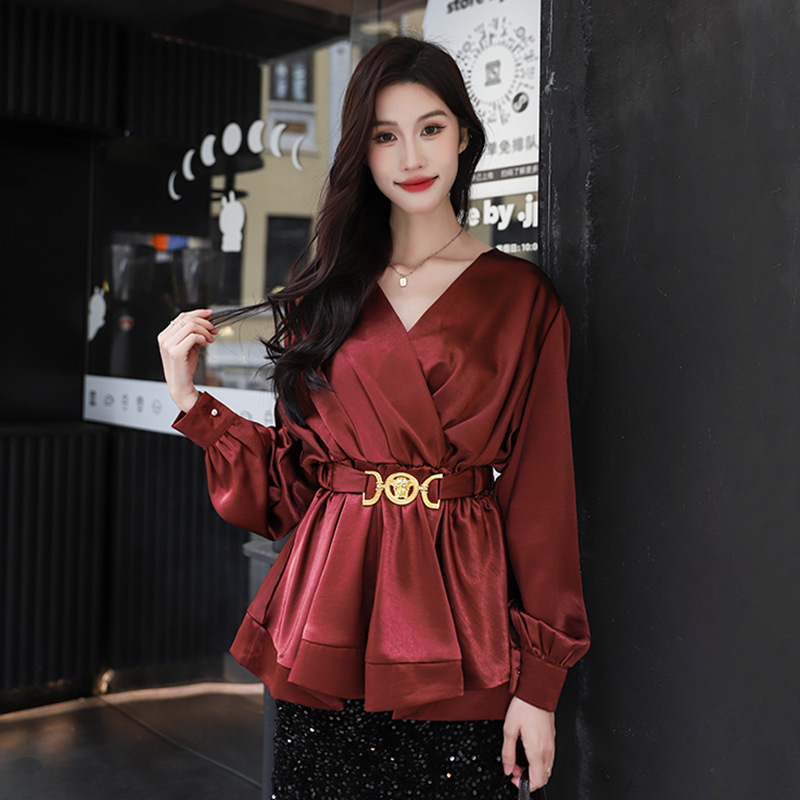 菲媛のフランス式の軽豪華なベルトを合わせて腰のvネックのシャツの女性の気質を収めます。
