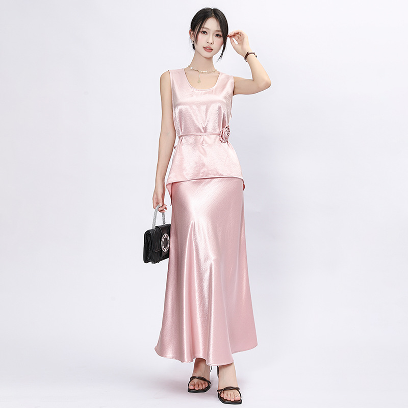 フェイユエンのエレガントなサテン生地のツーピースセット(女性用)ノースリーブの紐付きウエストマークトップス+フィッシュテールロングスカートセット、在庫処分、着痩せ効果あり