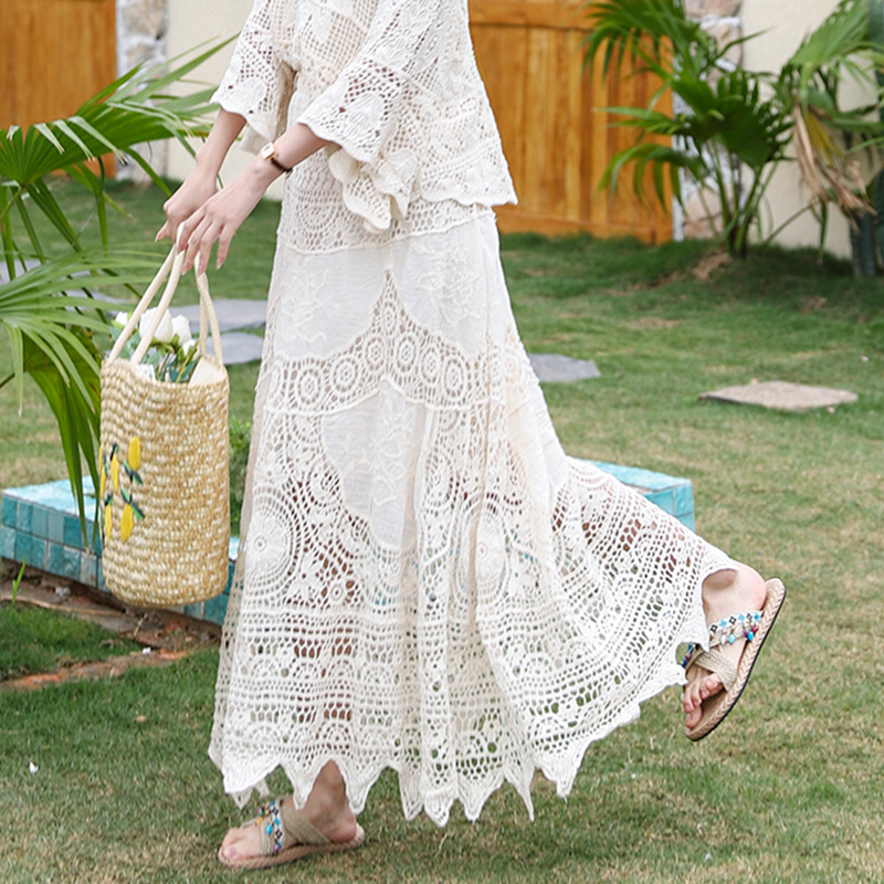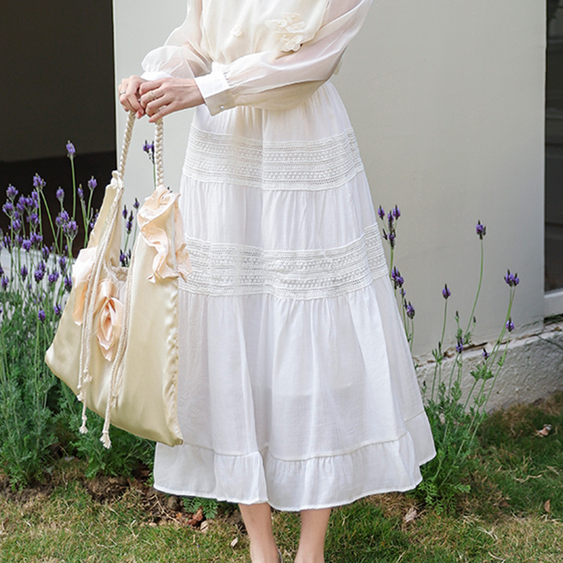 Feiyuan ニッチデザイン重工業かぎ針編みレーススカート女性のためのフランスの優しい通気性ソリッドカラービーチスカート