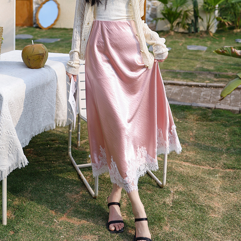 菲媛春夏の甘いレースのサテンのa字のスカートの女性のフランスの気質の優雅な百合の垂感の半身のスカート