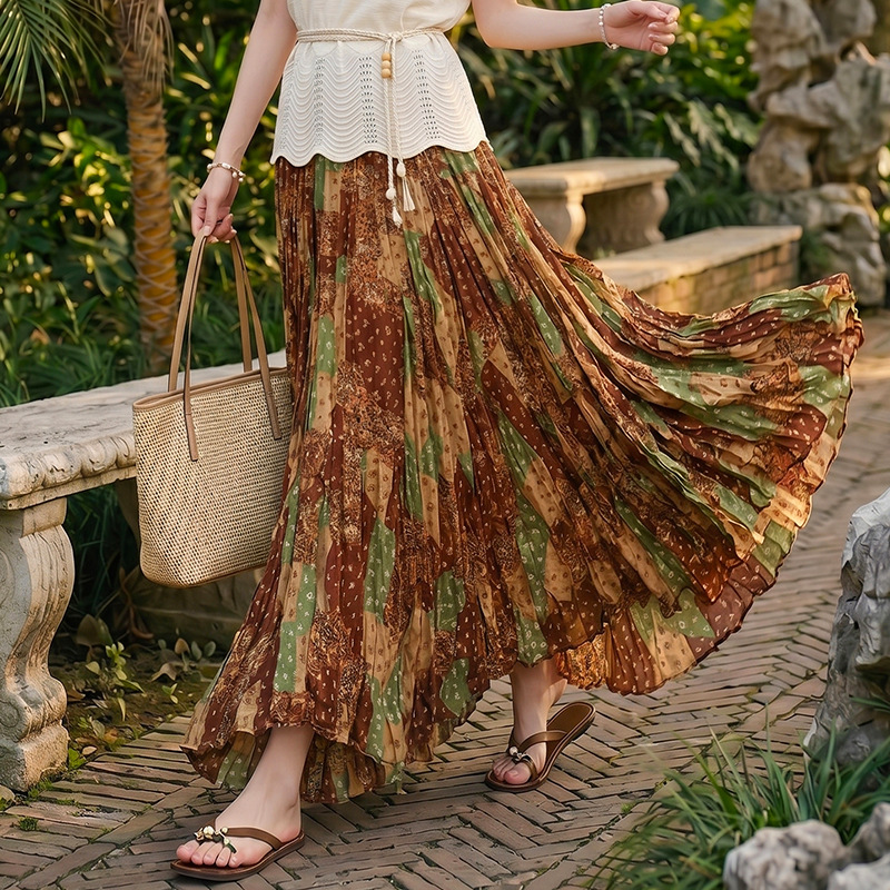 フェイユアン レトロ風グラデーションカジュアル万能ローズ柄大振りスカート 早春新作ドレープ感プリーツAラインプリーツスカート