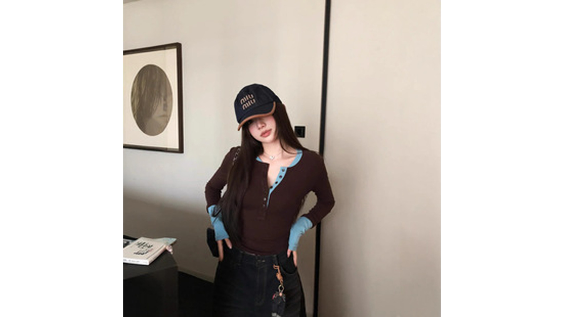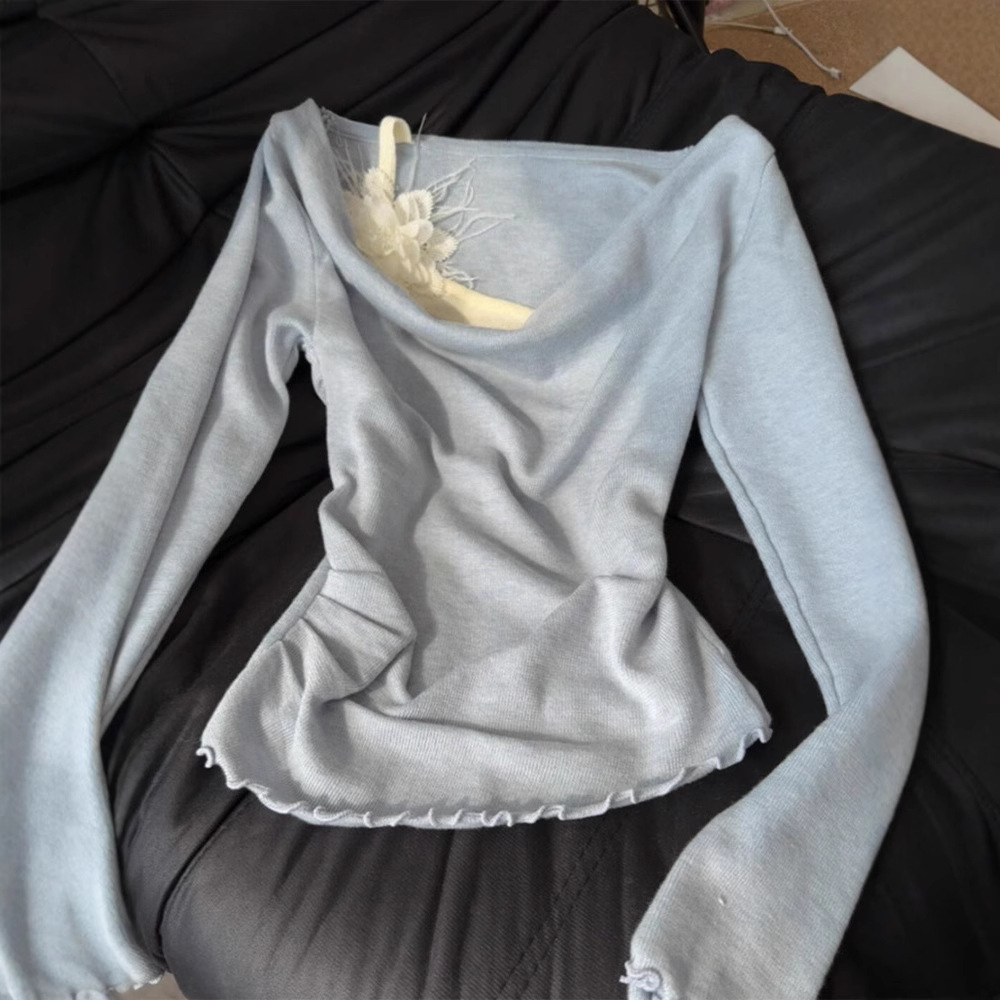 青い偽の2つの襟の長袖のtシャツの女性の春の2025新型のデザイン感の小さい大衆の中で底のシャツの上着を掛けます。