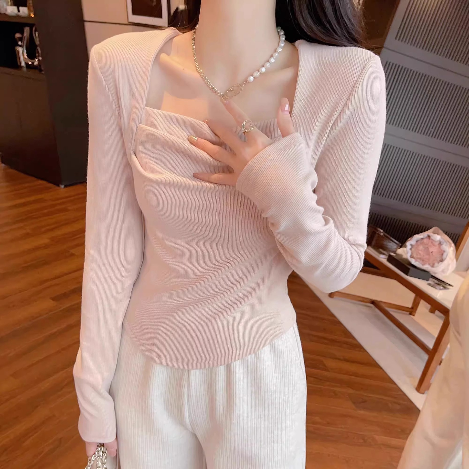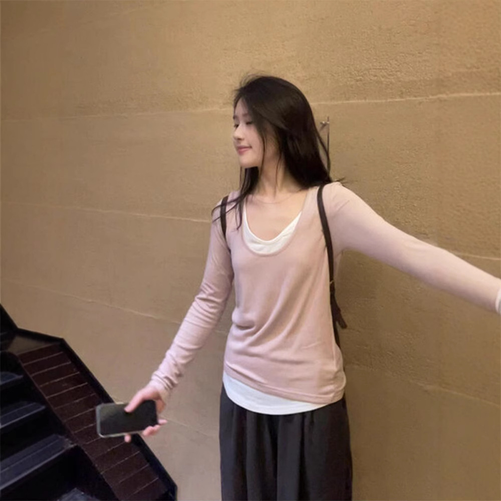韓系の優しいピンクの偽の2つの長袖のtシャツの女性の春秋の2024の新型の修身の怠惰なU襟の底のシャツの上着