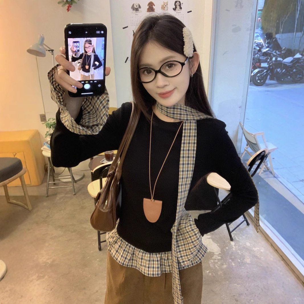 韓国系の偽の2つの格子縞のつなぎ合わせの中に長袖のtシャツの女性の春のデザイン感があります。