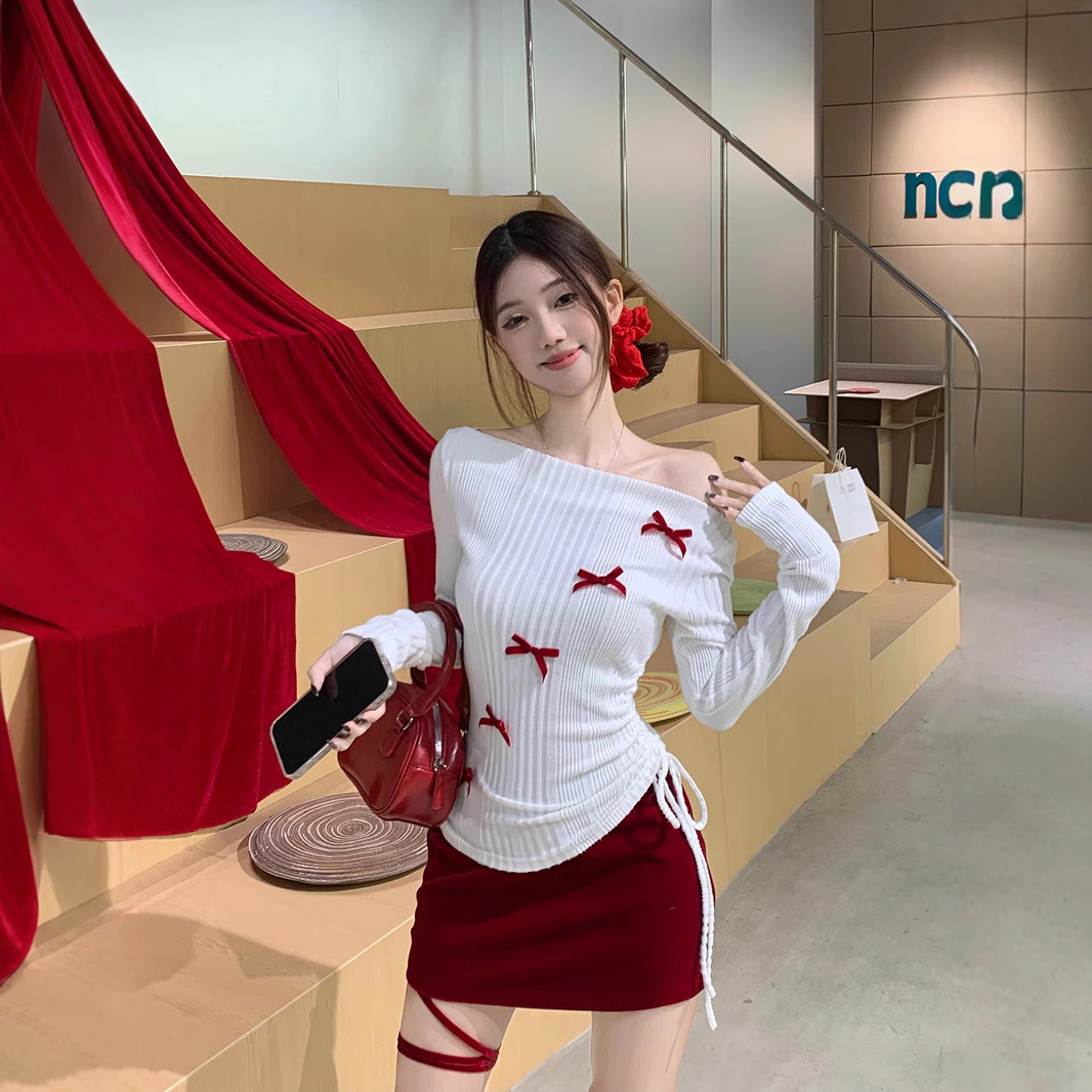 春のchi韓系の修身は底を打って縄のtシャツの婦人服の優しい甘い風の蝶結びの肩の長袖の上着を引きます。