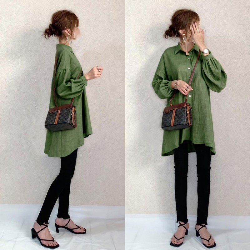 2025年日本風ミドル丈折り返し襟カーディガン、ドロップショルダー、パフスリーブシャツ